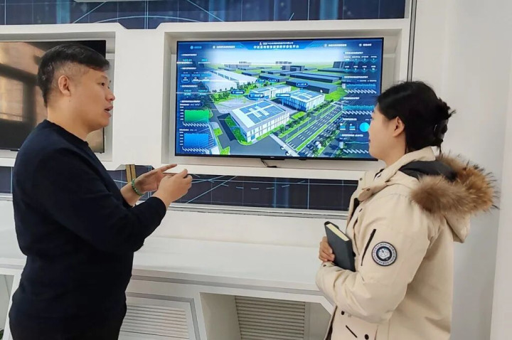 12月10日,河北雄安远遥科技有限公司创始人朱光宇(左)向访客介绍企业自主研发的智慧能源数字孪生平台。河北日报见习记者康晓博 摄